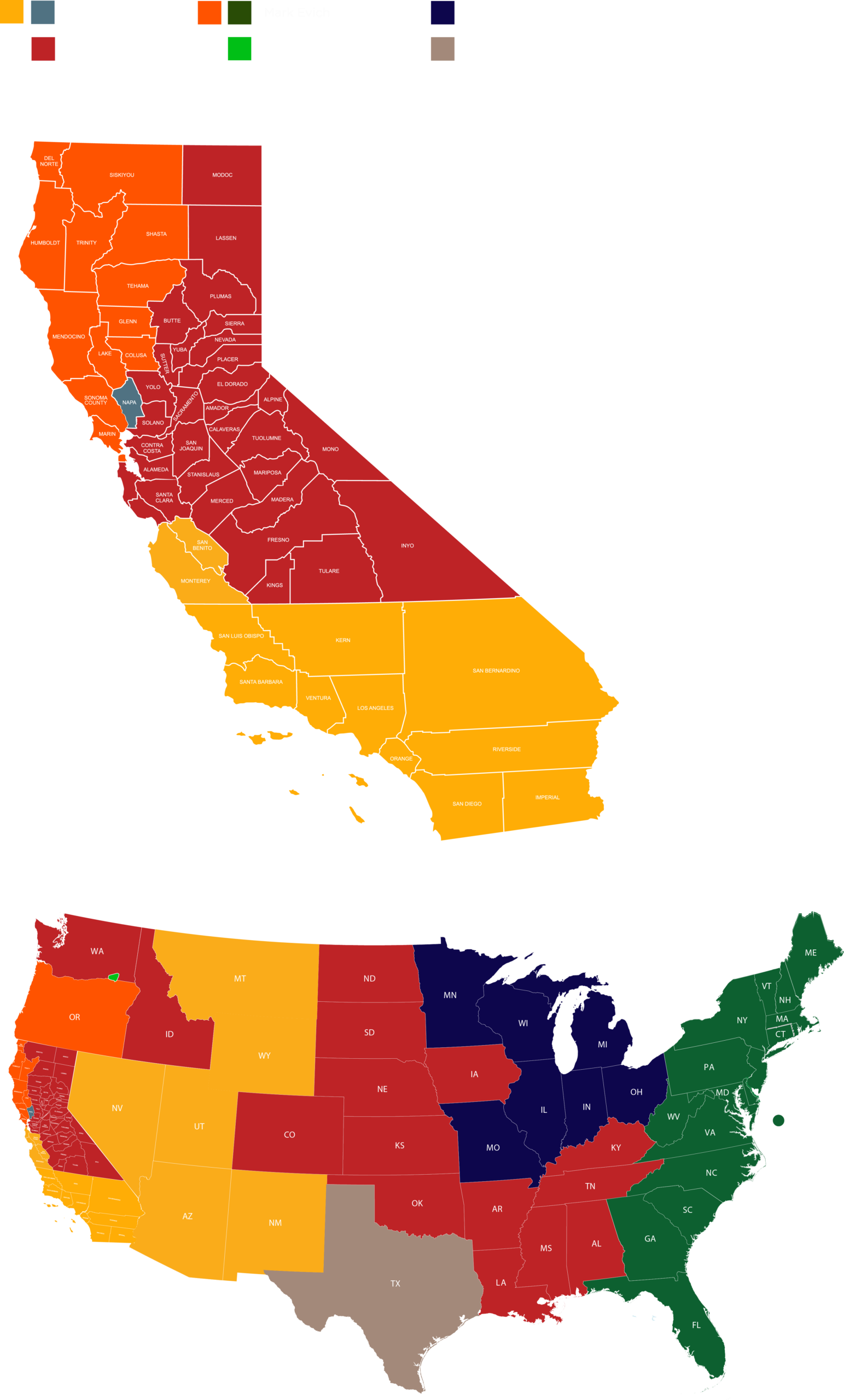 CA: Sierra Foothills, Central California, Santa Cruz, East Bay, South Bay;
